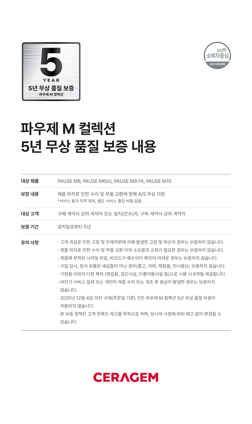 파우제 M 컬렉션 5년 무상 품질 보증 정책 안내